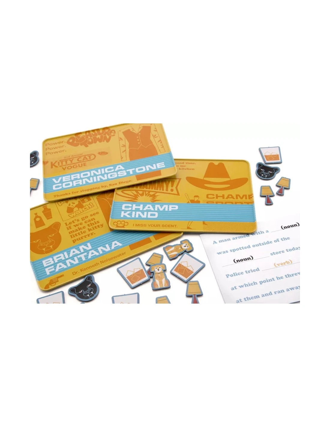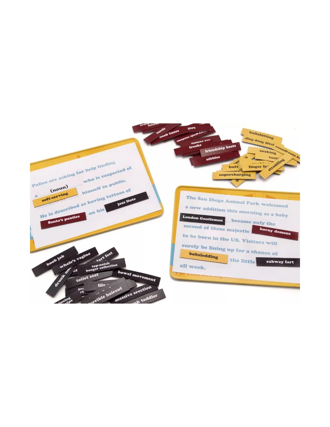 Play as your favorite anchors from the Channel 4 News Team as you sabotage your rivals’ news stories with ridiculous magnetic words and phrases on beautiful magnetic trays. If they laugh while reading the news, you win! Features the world’s first and only Sex Panther Mechanical Timer. Whammy!