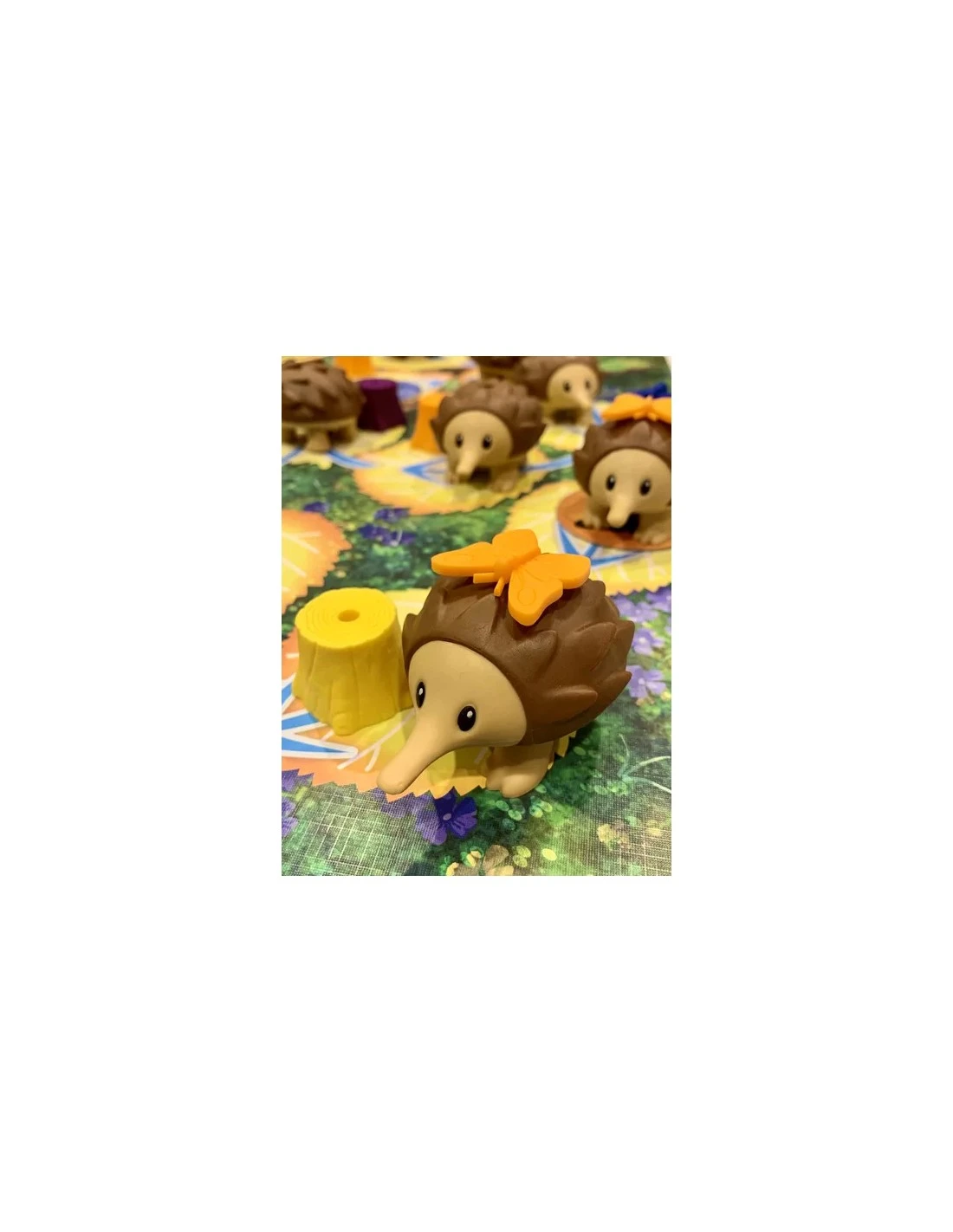 In more detail, players move the twelve echidnas from leaf to leaf, picking up bugs in their color from their pick-up leaf, and moving them to the three matching-colored stumps. But the forest floor is a traffic jam of echidnas that have to be moved out of the way before you can get there. The first player to deliver all three bugs wins.