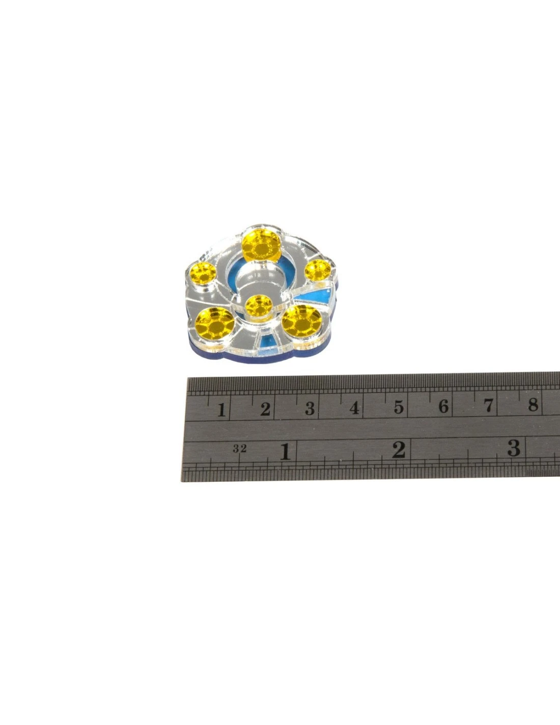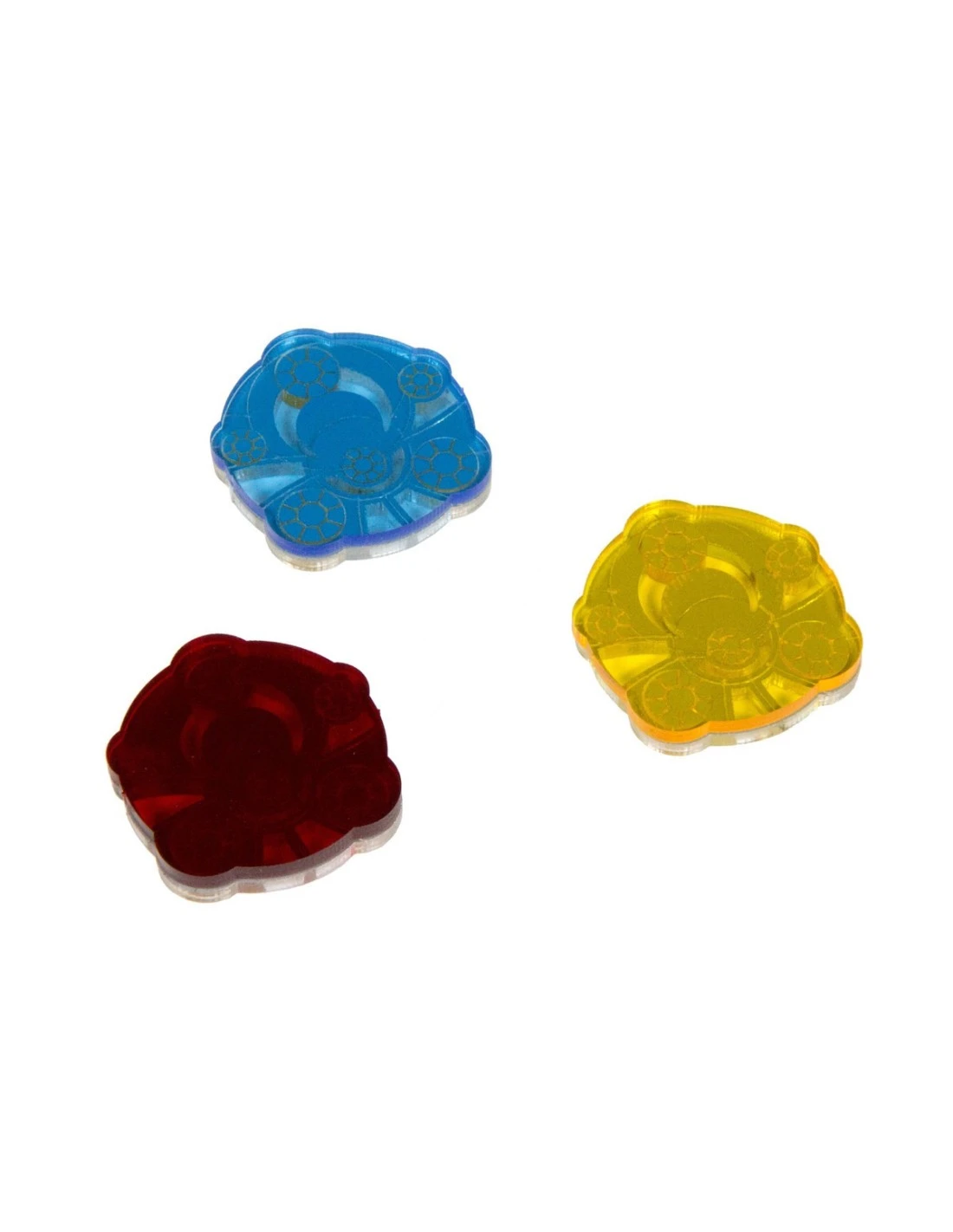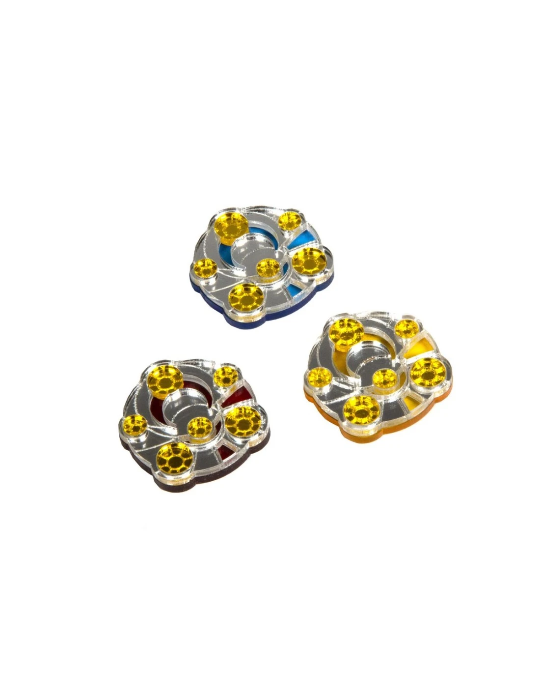 Deze set bevat 1 rood, 1 geel en 1 blauw token gelaagd met een zilver gespiegeld patroon en ingesloten met gele gespiegelde edelstenen.