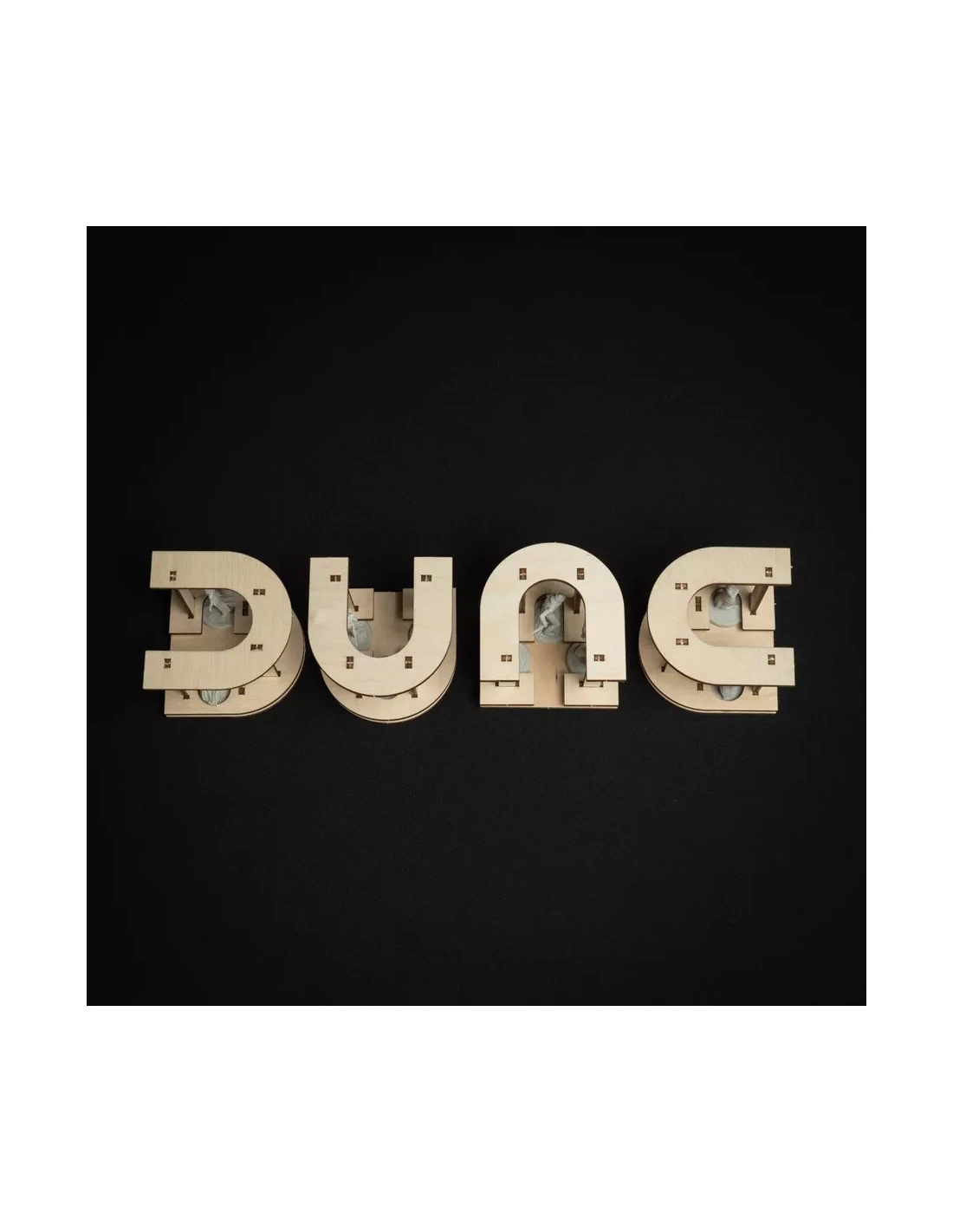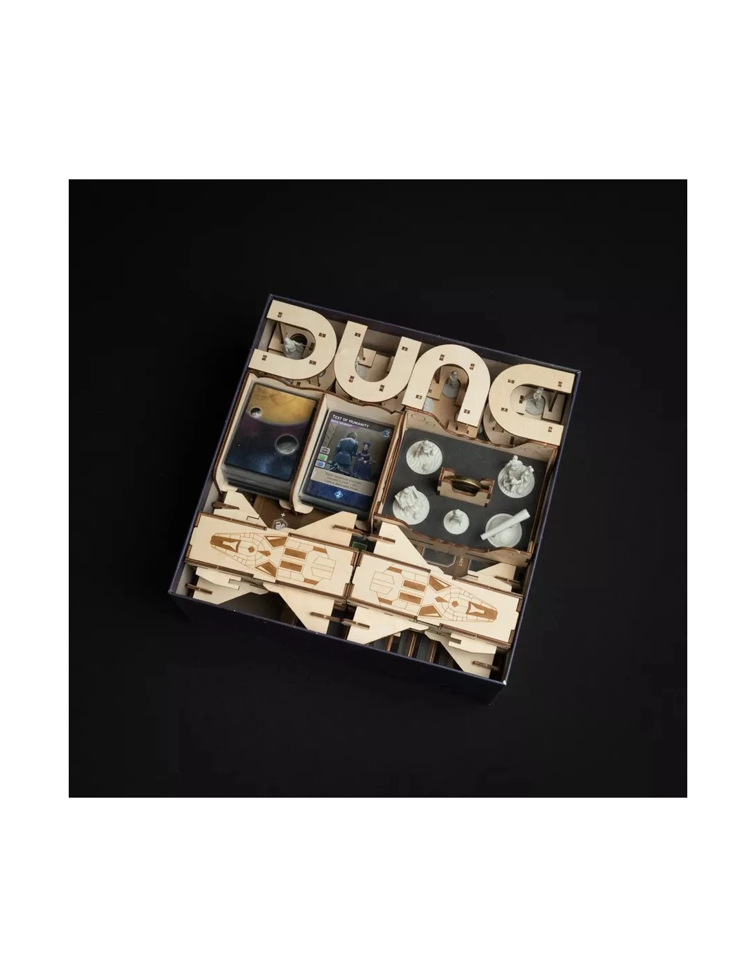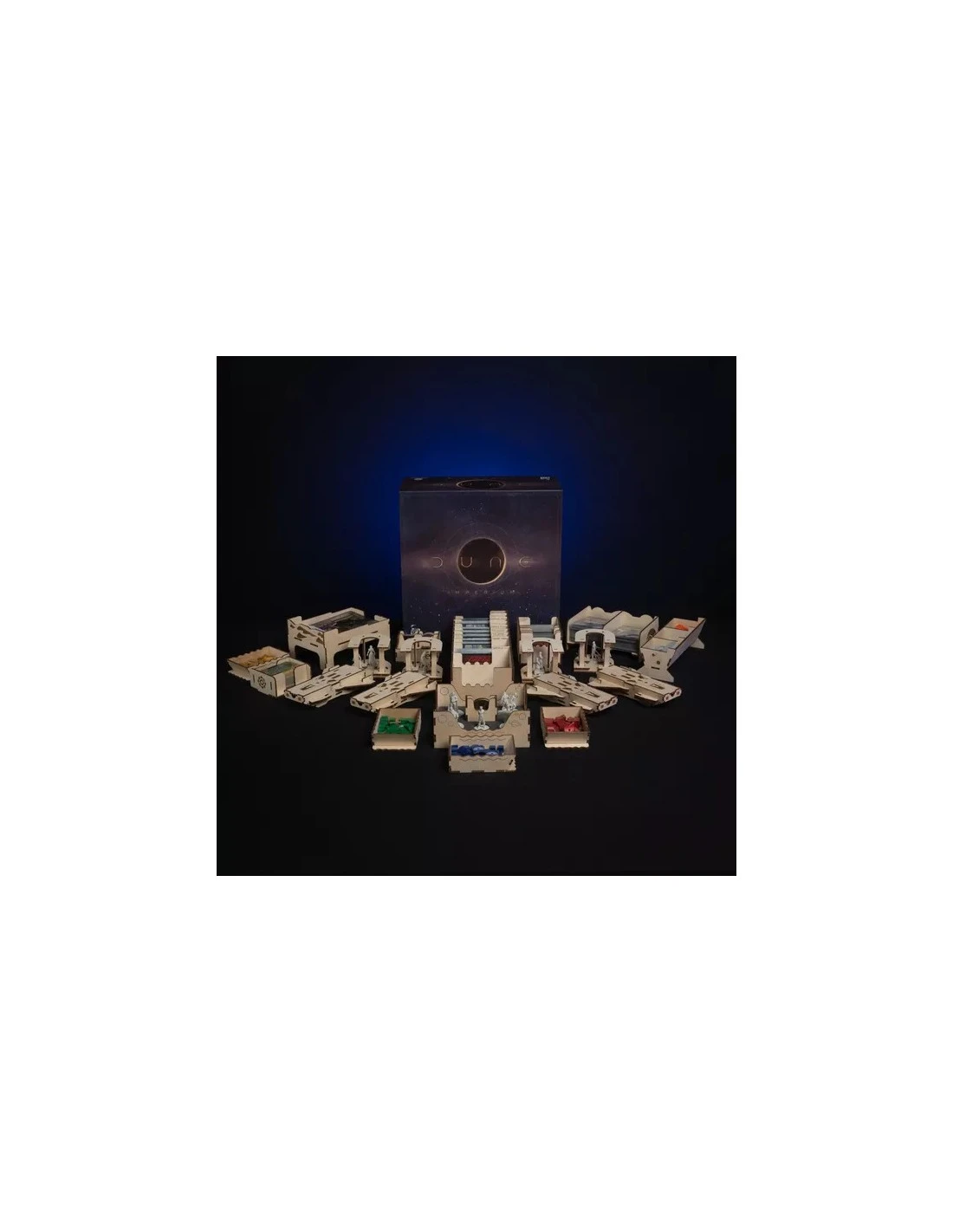 We have designed a Deluxe Organizer for the deluxe components of Dune:Imperium. With the D, U, N and E-shaped miniature holders and the spaceship boxes for player components you can immerse yourself even deeper in the Dune Universe.