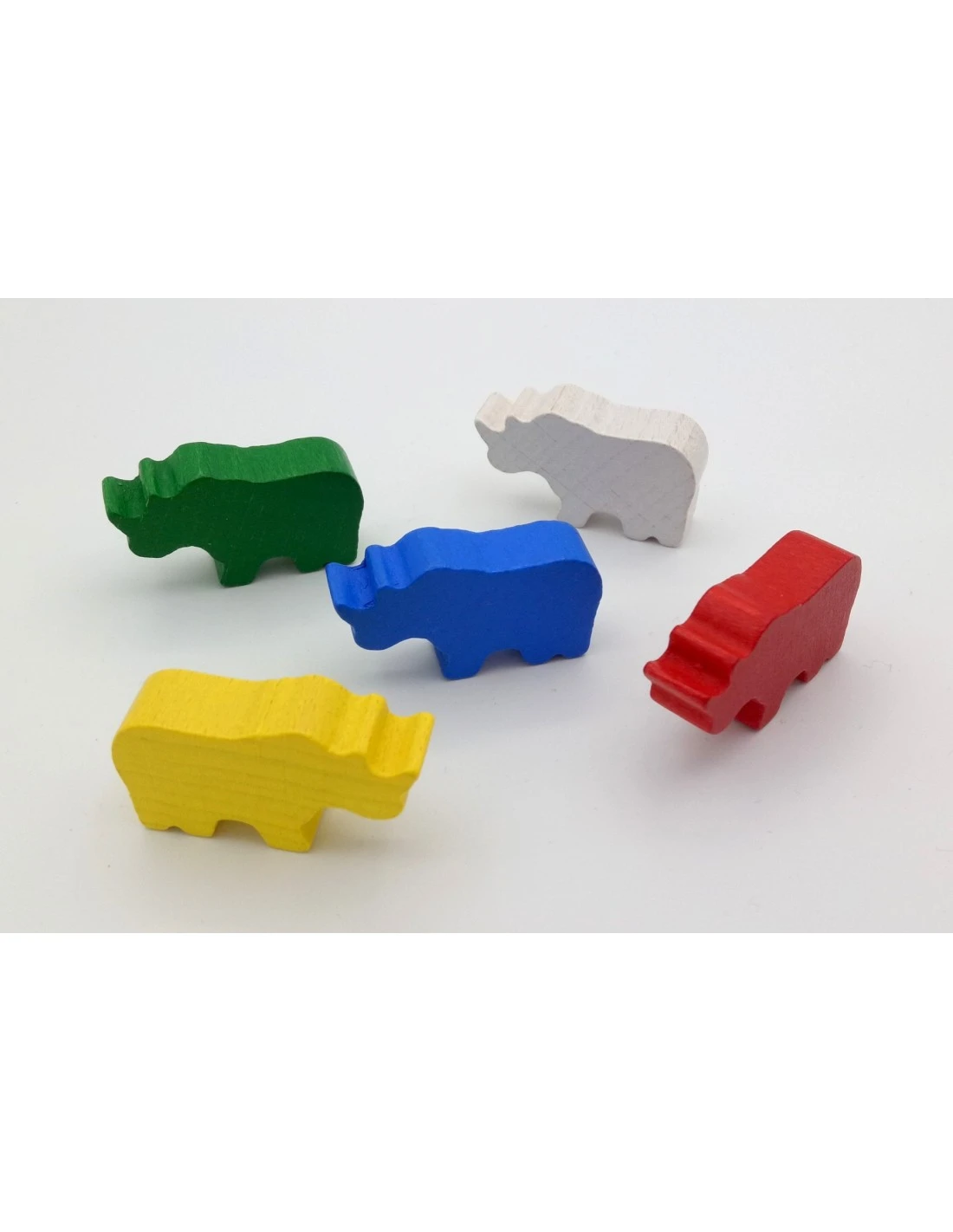 Houten spelfiguur in de vorm van een neushoorn. Het dier is ca. 4 cm lang, 2 cm hoog en 1 cm dik. Verkrijgbaar in verschillende kleuren.