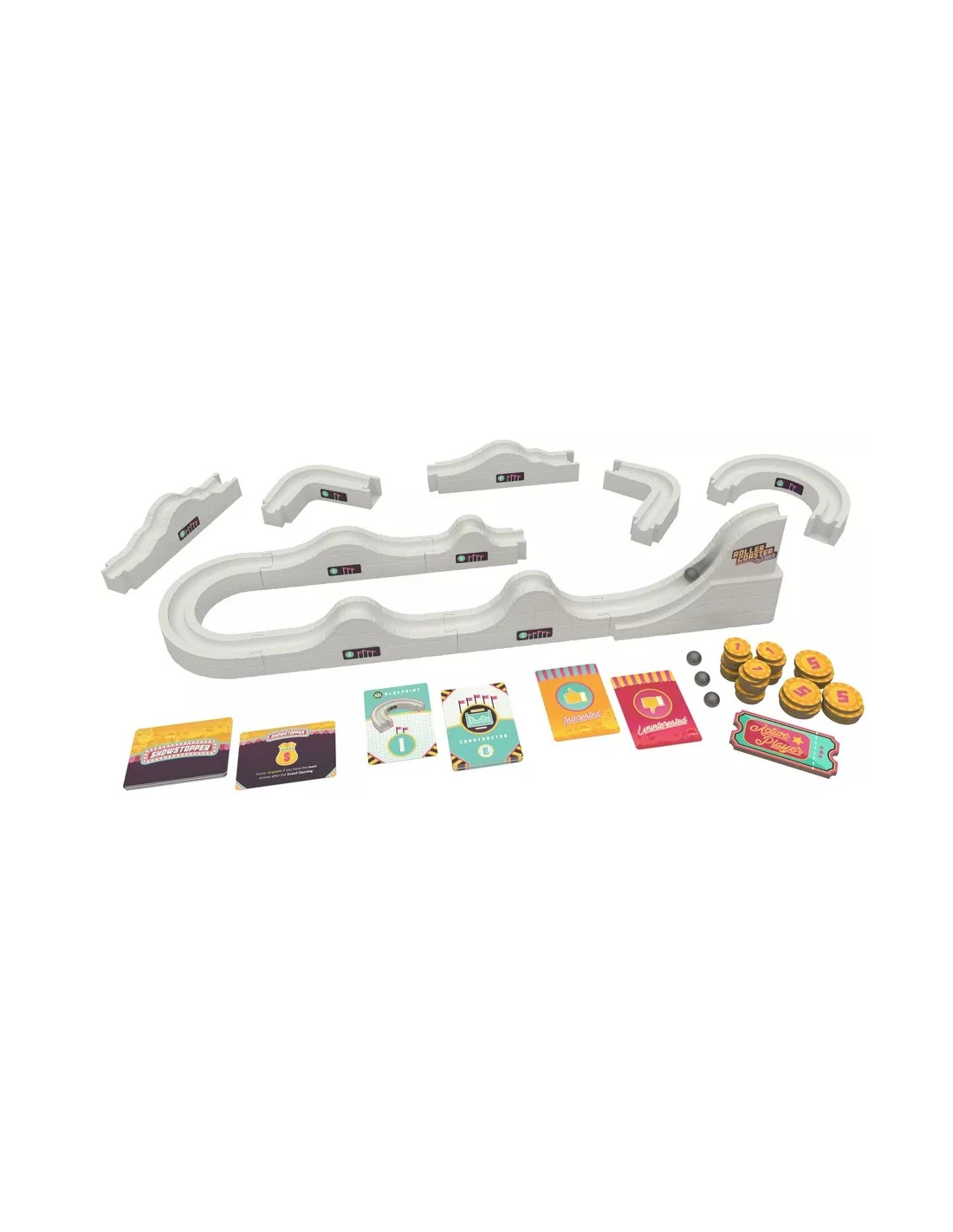 Welcome to Roller Coaster Rush, a coaster-building game with oodles of kinetic fun! Your goal is to design and construct the best roller coaster for your investors’ theme park! At the start of each game, you design a model coaster using the blueprints you have available. During the game, you’ll attempt to actually construct your model by winning auctions for the track pieces you used in your design.