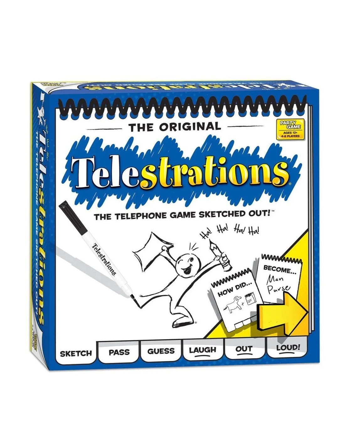 “Each player begins by sketching a TELESTRATIONS word dictated by the roll of a die. The old fashioned sand timer may limit the amount of time they get to execute their sketch, but it certainly doesn’t limit creativity! Time’s up! All players, all at the same time, pass their sketch to the next player, who must guess what’s been drawn. Players then simultaneously pass their guess — which hopefully matches the original word (or does it??) — to the next player who must try to draw the word they see — and so on.”